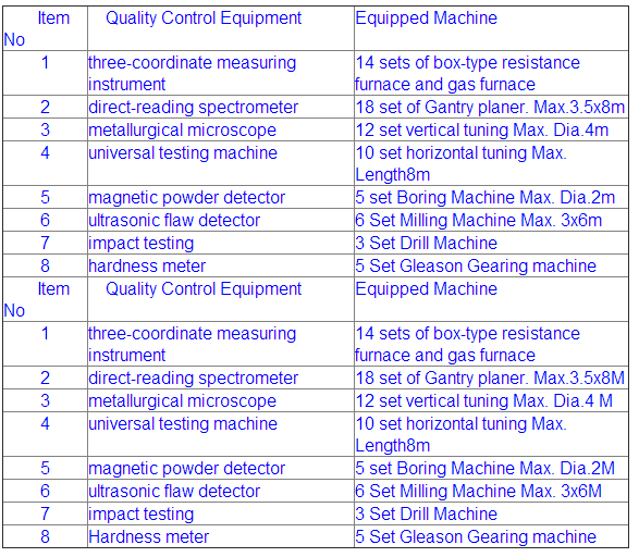 公司還擁有有機樹脂硅酸鈉自凝砂、二氧化碳硅酸鈉砂四條生產線,14臺箱式電阻爐、煤氣爐。車間各類起重設備180余臺,金屬加工設備200余臺,其中3.5mx8 m龍門刨床、最大4米立式車床等大型設備40臺。