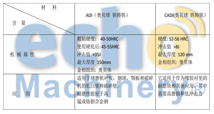 鑄鐵具有高碳、易碎鐵的特點。適用于不要求沖擊和振動力的場合。翼凱機械將與您分享新的ADI(奧貝球鐵)和CADI (Carbidic奧貝球鐵)鑄鐵材料。以下是ADI和CADI技術表。